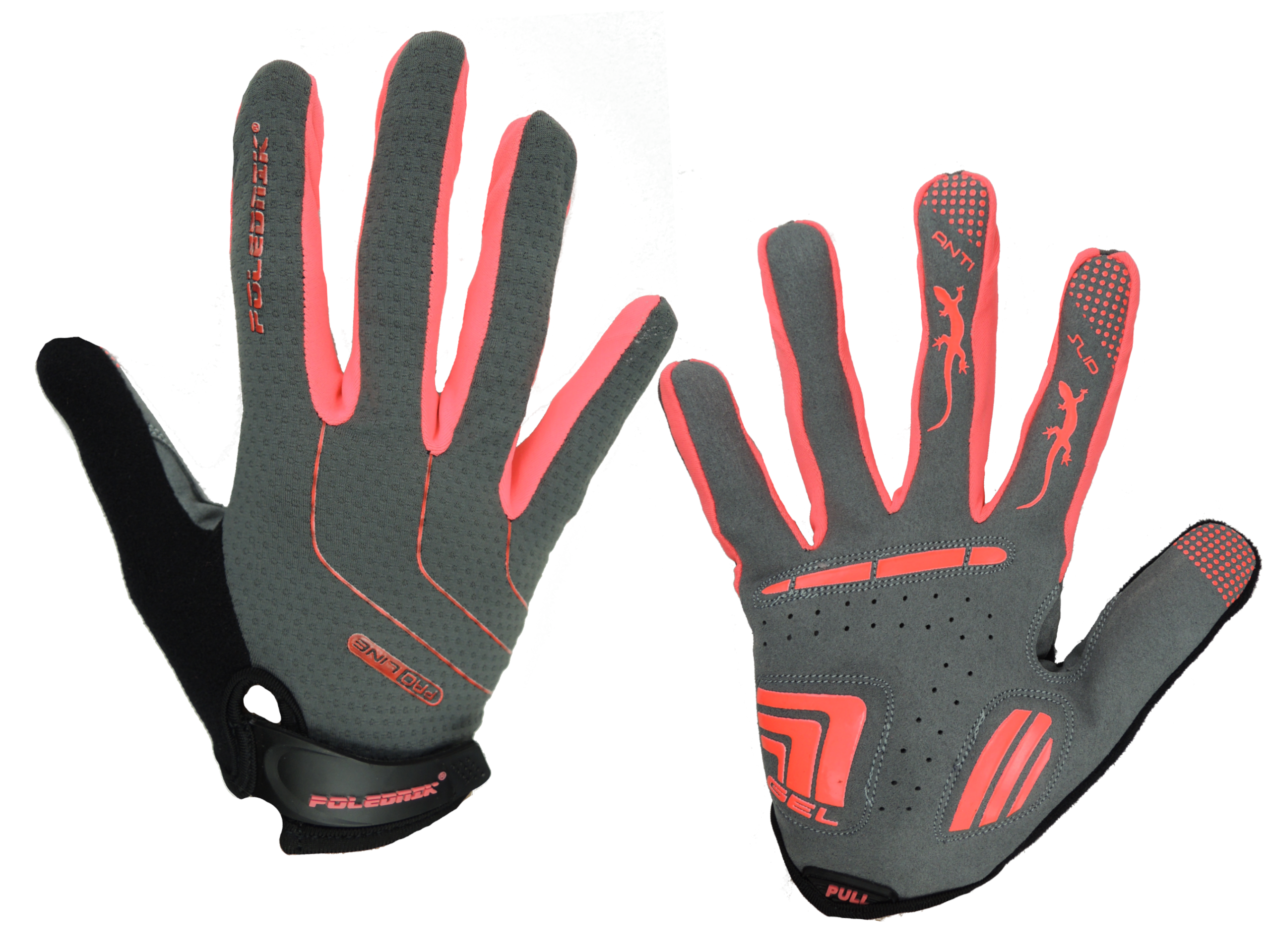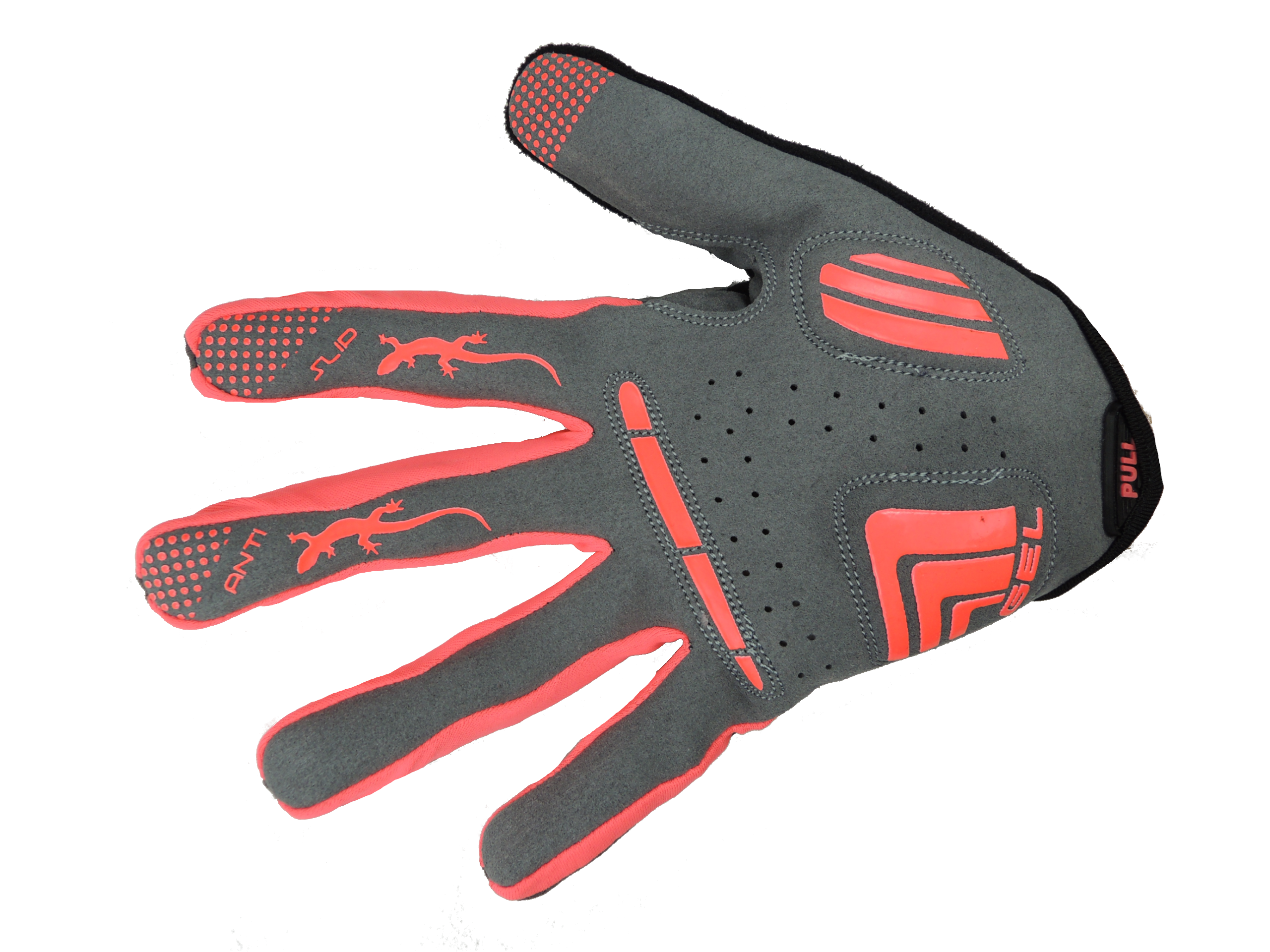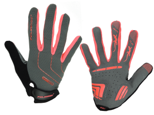 Dłoń: Skóra syntetyczna, otwory wentylacyjne, wypusty żelowe, naszywki gumowe zapobiegające ślizganiu się rękawicy.