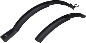 Univerzální sada blatníků s montáží pomocí kovového úchytu a pružné objímky. Pro kola: 24" - 26" a trek 28" Rozměry: Šíře 57 mm Materiál: PP Barva: Černá Hmotnost páru blatníků: 270 g včetně úchytu